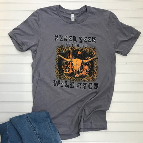 Our Never Seen Anything Wild As You T-Shirt is an charcoal t-shirt with a cactus country vibe. It's made with an ultra-soft, wrinkle-resistant blend of 48% polyester and 52% cotton. Super soft and stylish this t-shirt is sure to be a go-to any time of the year.