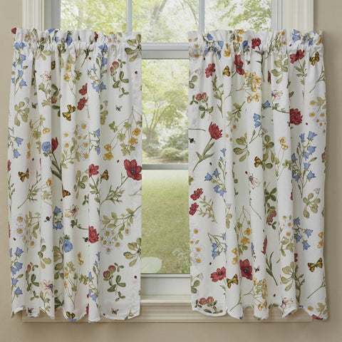 Add country floral charm to your room with the Meadow Flowers Scalloped Tiers Set of 2. Featuring scalloped edges and a delicate floral design of wildflowers, butterflies and an occasional bumble bee on white fabric. Unlined.
