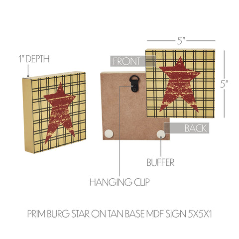 Add a touch of rustic charm to your tabletop decor with the Prim Burgundy Star on Tan Base Sign. This square-shaped sign, measuring 5x5 inches, features a primitive star design that exudes timeless appeal. Crafted from durable MDF material, it offers both longevity and a rustic aesthetic, making it a perfect addition to your patriotic, fall or primitive-themed decor. The dark tan base provides a warm and inviting backdrop for the striking burgundy primitive star, creating a visually appealing contrast that captures the essence of rustic simplicity.