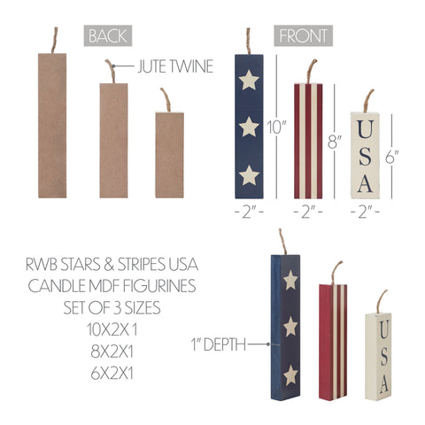 - Patriotic Stars & Stripes Design: The set of three figurines features decorative wooden candles with stars, stripes, and "USA" patterns, bringing a festive, Americana-inspired touch to your home decor.