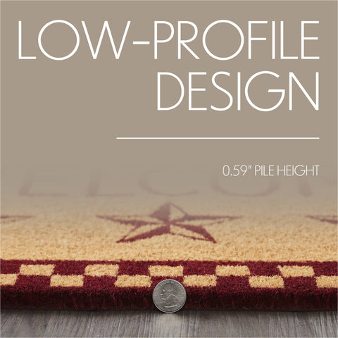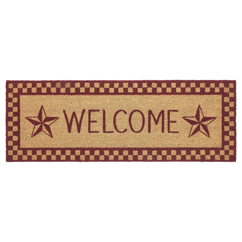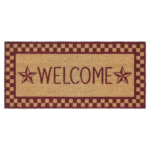 Welcome guests with the charming Bedford Burgundy Check Stars Coir Welcome Rug. This delightful doormat features a bold "Welcome" message adorned with rustic barn star accents, all beautifully enclosed by a burgundy checkered border. Set against a warm natural tan background, this rug adds a cozy touch to your entryway, making it a perfect fit for country or primitive-style homes. The Rug is designed to fit perfectly at your doorstep, while the non-slip PVC backing ensures stability, preventing slips and keeping the mat securely in place, even in high-traffic areas. The traditional checks and stars design creates a welcoming atmosphere that resonates with warmth and charm.
