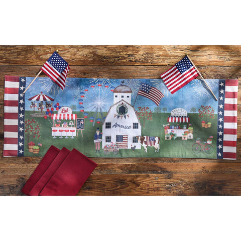 Add patriotic flair to your table with the Patriotism at the County Fair Table Runner. Featuring a Celebration of America theme. This table runner adds texture and color to your Americana table.