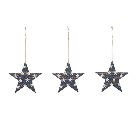 Add a touch of rustic elegance to your patriotic celebrations with the Patriotic My Country Stars On MDF Star Ornament Set of 3. These star-shaped ornaments feature a striking design of silver stars scattered across a rich patriot blue background, complete with a distressed finish that adds vintage charm. Each ornament is equipped with a durable jute twine hanger, making them easy to display in various settings. Perfect for enhancing Fourth of July decor or year-round Americana-inspired interiors, these ornaments bring warmth and character to your living room, dining room, kitchen, or entryway. Use them to adorn wreaths, garlands, or hooks, or hang them individually for a subtle patriotic accent. Their versatile design complements rustic farmhouse, country, and primitive decor styles, adding a timeless nod to American pride.Â