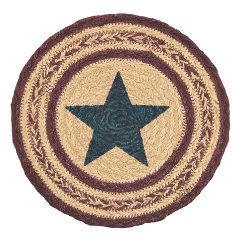 Invite an instant Americana classic into your home or retreat with the braided Navy Star Braided Jute 8" Trivet! Featuring variations of burgundy, navy, and natural jute braids. One stenciled navy 5-point star is proudly displayed in the center. Reverse has no stenciled stars.
