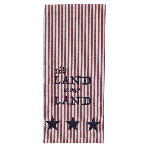 Show your patriotic spirit with our This Land Dish Towel.  It features red, white and blue colors and the words "This LAND is our LAND" embroidered.