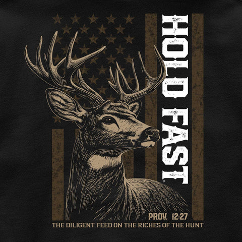 Patriot. Provider. Protector. This “Deer Flag” Hold Fast® Adult Hoodie in Black speaks to the heart of a man who honors his responsibilities and finds his strength in God. The design features a proud buck and distressed American flag—a bold combo that reflects grit and grace.