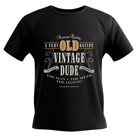 Vintage Dude T-Shirt.  Features a superior Airlume combed and pre-shrunk ring-spun soft fabric.  Vintage Dude design printed on the front.  Vintage Dude - the man, the myth, the legend.  Great Gift Idea!