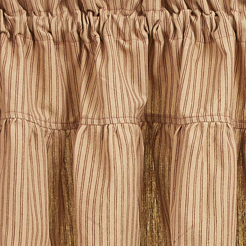 The Bridgeton Wine Ticking Ruffled Valance features classic burgundy wine and tan ticking stripes and ruffles. The perfect blend of farmhouse elegance and country charm. Unlined.