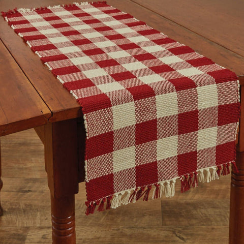 Add a primitive country touch to your table with the Buffalo Garnet and Tan Check Yarn Table Runner. 100% cotton yarn weave.