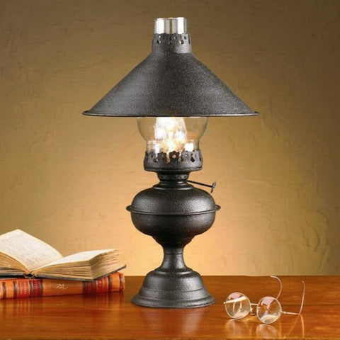 Our Hartland Lamp with Shade is an ideal accent piece in your country or primitive home. Hand crafted with a unique style and charm reminiscent of a 19th century oil lamp, it features a textured brown-black rustic finish. Shade and chimney are included.