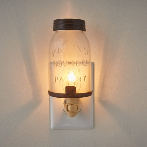 Rustic country charm awaits with this unique Mason Jar Night Light. Made of sturdy cast metal and glass with etched "Mason's Nov 30th 1858 Patent". At night it softly illuminates with a warm glow that is ideal for entryway, stairs, kitchen, or bathroom.