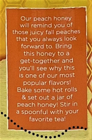 Fine pure raw honey from Missouri's Honeysuckle Acres. Infused with Peaches - this peach honey will remind you of those juicy fall peaches that you always look forward to. Bring this honey to a get-together and you’ll see why this is one of our most popular flavors