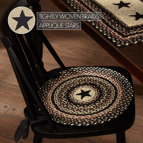 With the Revere Round Chair Pad, you'll get the farmhouse feel without sacrificing comfort or durability. Our tightly woven jute braided chair cushions with ties are designed to relax and lay flat unlike 100% jute cushions. We tightly weave together natural, country black, and bright red braids surrounding a prominent star applique for a long-lasting chair cover. Now you can have that braided, burlap design right in your kitchen! For a complete look, pair with our Revere Placemats and Table Runners. Sold Individually.