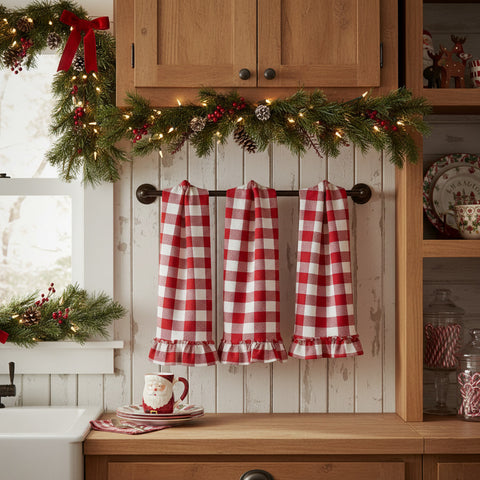 - Farmhouse Chic: Add a touch of Farmhouse chic to your kitchen and bathroom decor with the Cotton Cherry Ann Check Red Button Loop Kitchen Towel Set of 3. Featuring the classic Buffalo Check pattern, these hanging kitchen towels bring rustic charm to your home.