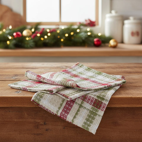 You will love the simple color palette of the Christmas Barn Dishcloths Set of 3. green, red, taupe and off white plaid combine to create a beautiful farmhouse flair! Also available in coordinating placemats, table runners, napkins and dishtowels. (all sold separately)