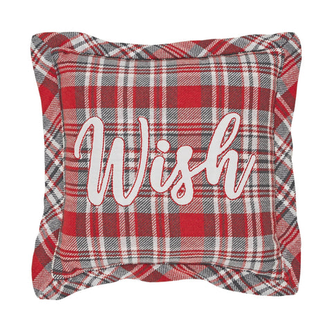 Add a little pop of festive holiday style with this plaid Christmas accent pillow. The Greland Plaid Wish Pillow measures 12 by 12 inches. The filled pillow features a warm plaid base with red, gray and white stripes for a retro cabin look. White felt applique forms word art reading, Wish. The cozy home accessory includes a wide edging in tartan plaid for rustic lodge style. Spot clean as needed.