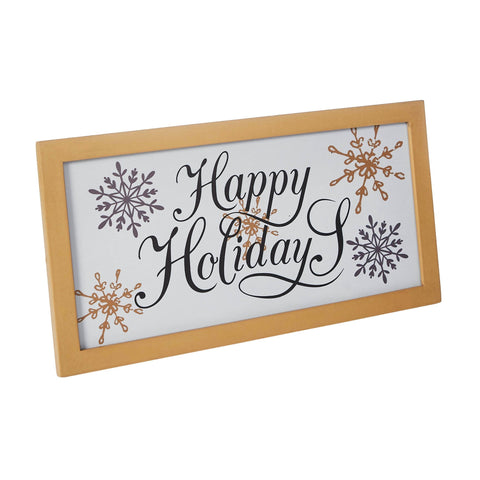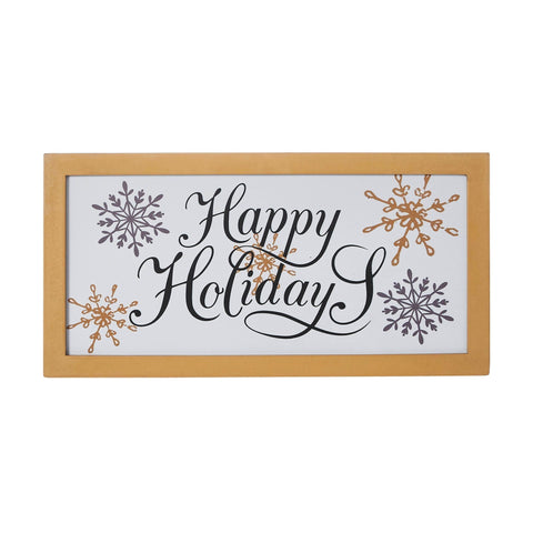 - Add a touch of holiday cheer to your home decor with this charming wall hanging sign, measuring 8x16 inches, featuring the festive message "Happy Holidays" framed with delicate snowflakes.