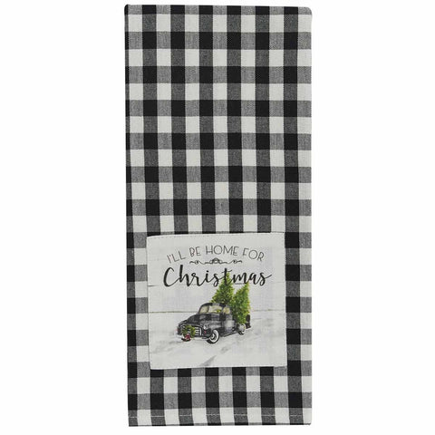 Welcome the Christmas season into your home with our Home For Christmas dishtowel.  Features a gingham print with a truck carrying trees and the phrase "I'LL BE HOME FOR Christmas".