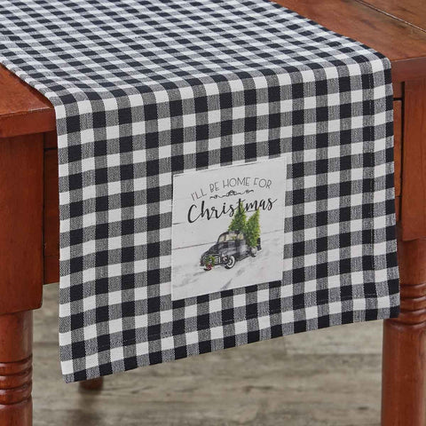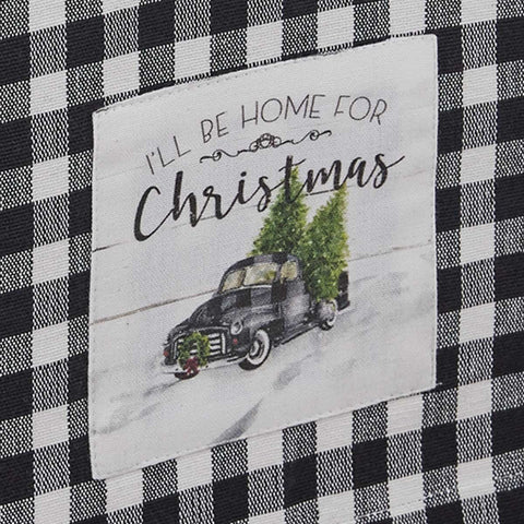 Set your farmhouse holiday table with the black and white check Home for Christmas Table Runner. Featuring black and white gingham checks and stitched vintage truck blocks on each end. It makes a stunning Christmas holiday table statement.