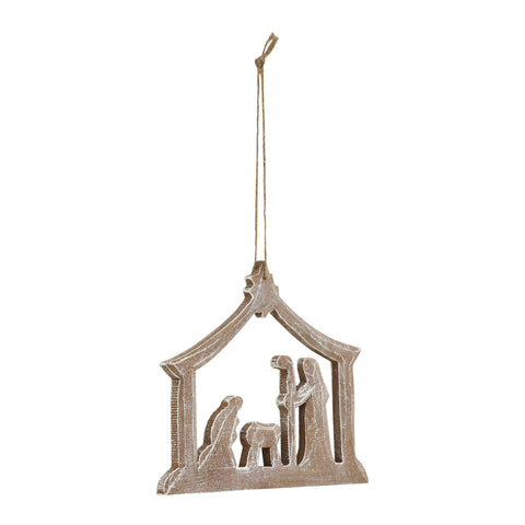 Celebrate the true meaning of the season with the Nativity Ornament Feathered Finish. Crafted from durable MDF, this ornament features a traditional nativity scene in a vintage-inspired design with sculpted edges and a distressed feathered finish. Accented distressing in soft white over natural wood tan, it evokes the warmth and reverence of Christmas with a rustic, handcrafted look. Measuring 5 inches wide by 6.25 inches tall, this ornament is perfectly sized for hanging on a tree, accenting a wreath, or displaying on a mantel or shelf. Its solid color palette and aged finish lend a timeless appeal that blends beautifully with farmhouse, country, and classic holiday decor. The carved detailing adds depth and texture, enhancing its visual charm. Ideal for the bathroom, bedroom, dining room, entryway, kitchen, or living room, this inspirational ornament brings a meaningful touch to your Christmas decorations. Whether used as a subtle reminder of the season's message or as part of a larger nativity display, it adds heartfelt tradition to your home. For easy care, simply wipe clean with a soft cloth.