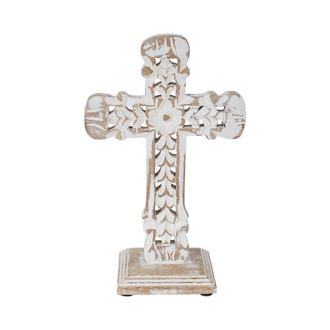Elevate your home decor with the Brands Natural & Distressed White Wooden Cross, a striking figurine that embodies a blend of rustic charm and spiritual elegance. Crafted from robust tropical wood, this piece showcases a central, elaborately carved rosette surrounded by stunning rippling patterns, capturing both attention and admiration. The entire structure is painted in a distressed white finish, accentuating the detailed carvings and adding a vintage touch to its farmhouse style. With its solid base, this cross stands securely, making it a versatile addition to any room in your home. This decorative cross seamlessly merges elements of country design with religious art, making it an ideal choice for creating a serene and inviting atmosphere. The whitewash and wood brown tones highlight the natural beauty of the wood and the craftsmanship involved in the carved graphics, which include floral motifs that add a touch of nature to the piece. Sized at 8x13 inches, it is perfectly proportioned to serve as a significant but unobtrusive addition to a variety of spaces, from a cozy nook in the living room to a prominent display in the entryway. Maintenance of this wooden cross is straightforward and effortless, requiring only a soft cloth to wipe it clean, thus ensuring it remains a cherished part of your home decor for years to come. Whether placed in a bathroom, bedroom, dining room, kitchen, or living room, the Wooden Cross with Rosette Center enhances any decor with its artistic flair and spiritual symbolism. It not only decorates a space but also serves as a constant reminder of faith and beauty in everyday life.