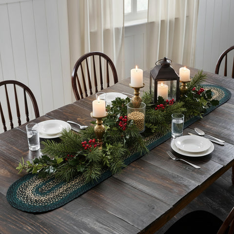 Bring the farmhouse to your tabletop with our Pinehurst Braided Runner. This rustic table runner is the perfect feature for your kitchen or dining room table. The homemade feel comes to life with the braided jute blend fabrics pine green, natural and black.  It's perfect for any time of the year and can also be used as the foundation for a magical display in any room where you want that rustic farmhouse feel.