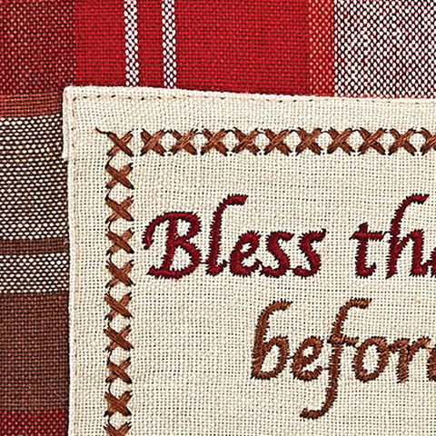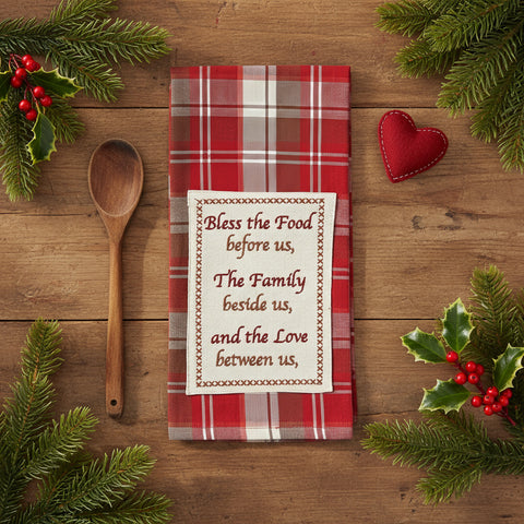 Add a loving touch to your kitchen with Red Chocolate Embroidered Dishtowel. This dish towel will serve as the perfect kitchen décor and/or gift.  Features embroidered phrase: "Bless the Food before us, the Family beside us and the Love between us".   Measures 18" x 28".