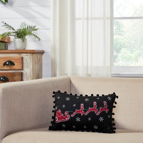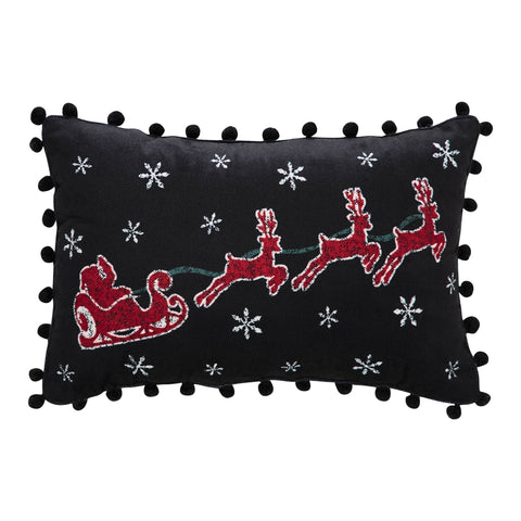 Add a little pop of festive style with this Christmas accent pillow. The Sable Ann Check Santa Sleigh Pillow measures 9.5 by 14 inches. The filled pillow features a charming distressed print for a vintage feel. A bold classic red sleigh and reindeer design creates a focal point that is supported by a background of soft white snowflakes. The cozy home accessory reverses to black and white buffalo plaid for casual farmhouse style while a mini pom pom border produces a warm and cheerful look. Spot clean as needed. Coordinates with the Sable Ann Check Collection for a modern farmhouse style for your whole home.