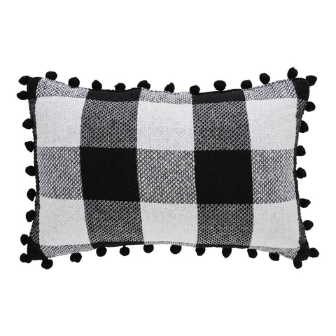 - Pom Pom Edging — Black edging with small pom pom details adds a whimsical feel to this playful Christmas decor. Reverses to a sophisticated black and white buffalo plaid.