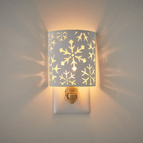 Winter charm awaits with our unique Snowflake Night Light. Made of sturdy cast with punched snowflake design..  At night it softly illuminates with a warm glow that is ideal for entryway, stairs, kitchen, or bathroom.