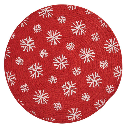 Set your table in holiday farmhouse style with our Snowflake Round Placemats 15" Set of 4. Machine stitching hold braiding together even with increased wear and tear. Reverses to same as front. Set of 4.