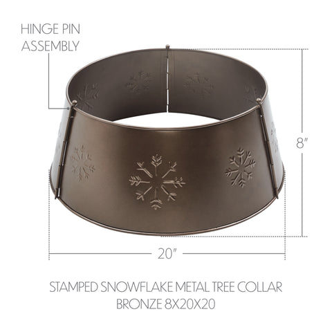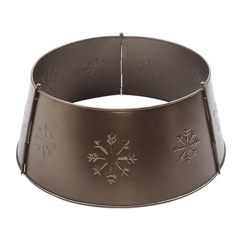 Elevate your holiday tree display with the Stamped Snowflake Metal Christmas Tree Collar in a rich bronze finish. Measuring 8x20 inches, this beautifully crafted tree collar features a classic round design adorned with intricate stamped snowflake patterns, adding a festive and rustic touch to your Christmas decor. Its warm bronze hue brings a cozy, vintage-inspired glow that enhances any seasonal setting. Constructed from durable metal, this tree collar includes a convenient hinge pin assembly for easy installation and a secure fit around your tree base. The solid color and textured snowflake design provide a polished foundation that complements a variety of holiday themes, from primitive rustic to traditional farmhouse. This accessory offers a sophisticated alternative to traditional tree skirts, combining functionality with timeless style. Perfect for use throughout your home-in the bathroom, bedroom, dining room, entryway, kitchen, or living room-this Stamped Snowflake Metal Christmas Tree Collar adds elegance and festive spirit to any space. Maintenance is simple with a quick wipe using a soft cloth to preserve its warm bronze sheen year after year. This classic piece is a must-have for creating a cohesive and charming Christmas display.