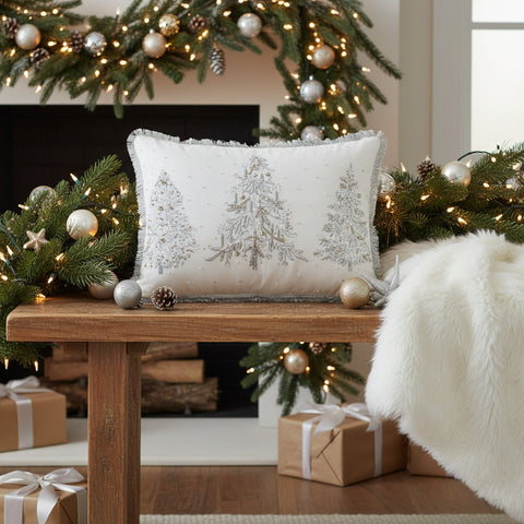 Add a touch of festive elegance to your home with the Christmas Embroidered Pillow with Beads. Designed for holiday charm, this 14x20 rectangular pillow features three beautifully printed Christmas trees in shimmering silver and gold. Each tree is delicately adorned with beaded accents, and tiny beads are scattered throughout the bright white background to create a subtle sparkle that catches the light. Crafted from soft polyester and finished with a refined silver fringe trim, this decorative pillow blends primitive rustic style with a hint of holiday glamour. The embroidered details and textured embellishments make it a standout accent in any Christmas decor arrangement.