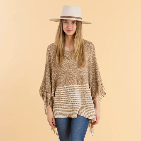 The Amber Chenille Poncho is a soft, mid-weight layer designed for comfort and versatility. Crafted in plush chenille, it provides cozy warmth without added weight—ideal for transitional seasons or cool indoor settings. The relaxed boat neckline and loose sleeves offer ease of wear, while marled yarns fade into subtle stripes for a flattering, tonal effect. Finished with side fringe for added movement and texture, this easy-to-style poncho transitions effortlessly from casual to elevated looks.