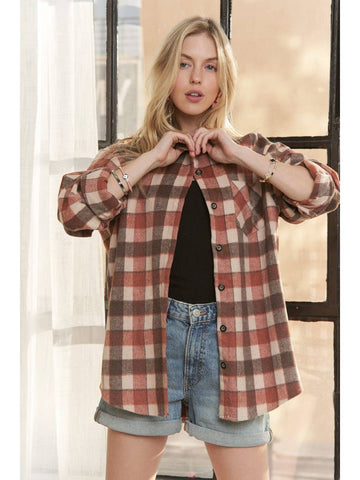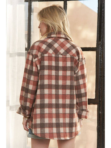 Stay warm and stylish this season with our Wine Plaid Button Up Flannel Shacket.