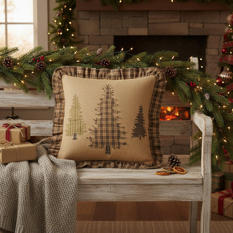 With rich texture and unique design, the Woodsy Ridge Tree Applique Pillow brings a rustic, nature-inspired look into your home. Fashioned in a soft burlap cotton with plaid cedar trees appliqued masterfully in woodsy color, this 18x18 throw pillow makes a relaxed statement in tan, cedar green, and dark brown. The classic plaid ruffle adds a little elegance to an otherwise unrefined, country pillow. Place on a soft chair or couch to create a cozy reading nook in your cabin.