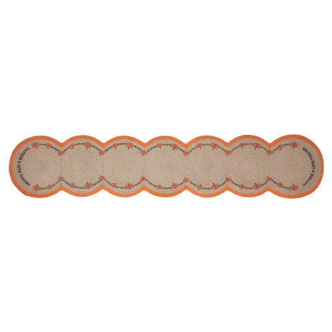 Elevate your autumnal dining experience with the Harvest Blessings Natural Stencil Pumpkin Table Runner. Crafted from a blend of braided cotton and polyester, this table runner boasts both durability and a soft touch, ensuring it withstands the rigors of daily use while adding a cozy charm to your dining space. Featuring an oval shape, it gracefully adorns your dining table or kitchen island, setting the stage for memorable fall and Thanksgiving gatherings. The table runner showcases a delightful stencil design featuring a charming border of pumpkins and vines, exuding the rustic allure of the harvest season. With hues of light khaki, burnt orange, and moss green, it captures the essence of fall foliage, infusing your space with the warmth and tranquility of autumn.