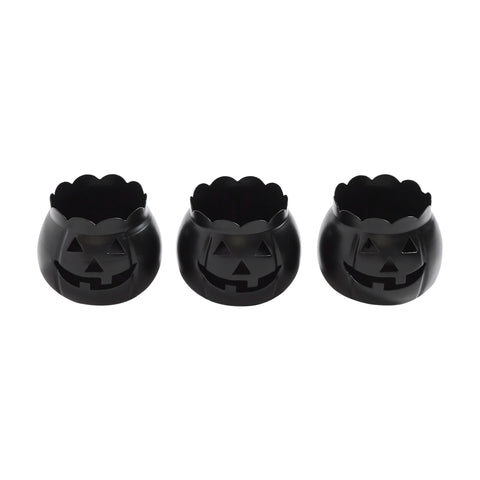 Add a spooky touch to your fall and Halloween decor with the Jack-O-Lantern Candle Holder Black Set of 3. These pumpkin-shaped tealight holders, measuring 3x3.5 inches, feature a classic Jack-O-Lantern face with a scalloped rim. The deep black color adds a bold, rustic element to your Halloween decorations, making them perfect for placing on your dining table, kitchen counter, or any area of your home that could use a bit of eerie charm. Crafted from durable metal, these primitive and rustic candle holders bring a timeless Halloween aesthetic to your home. The solid black color enhances the carved pumpkin face, creating a dramatic contrast that captures the essence of spooky season.