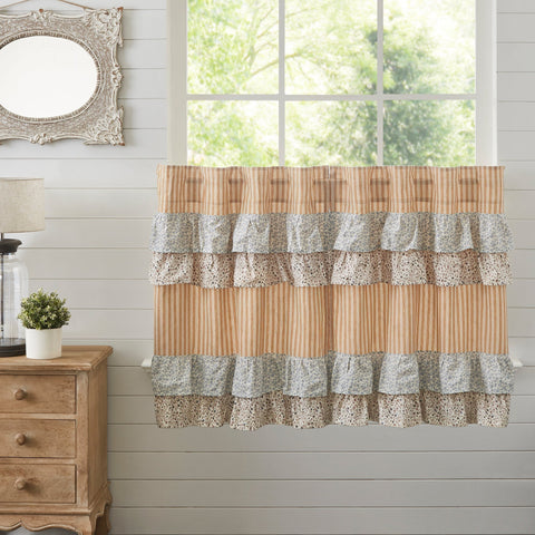 Bring the quiet and quaint fairytale cottage vision to life with our Kayley Gold Ticking Ruffled Tier Set. This gold and creme stripe curtain set is beautifully decorated. with graceful floral print ruffles towards the top that add rustic romance and heartwarming, cozy cottage vibes to your window