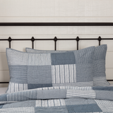 Brighten up your vintage farmhouse space with the Farmstead Blue Sham. Coordinating effortlessly with the Farmstead Blue Quilts, this country sham features vintage stripes, microchecks, and chambray coordinated in a simple block layout to create a refreshing, cozy atmosphere. Reverses to a signature ticking stripe inspired by a vintage fabric find.