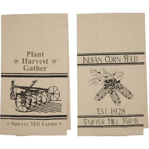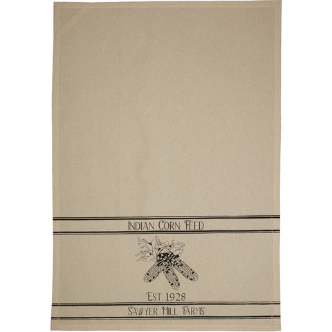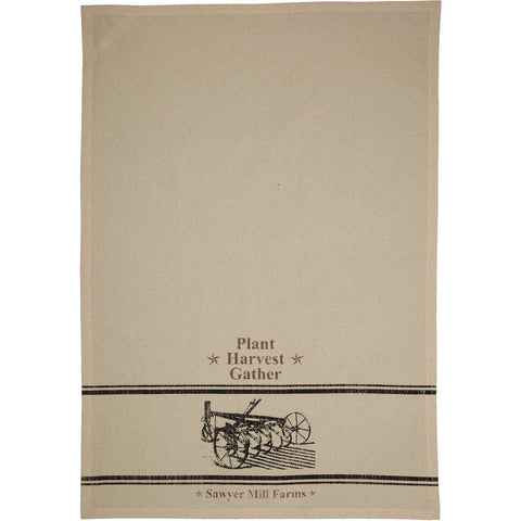 Add a fun, farmhouse element to your kitchen with the Farmstead Charcoal Plow & Corn Tea Towel Set. Crafted in unbleached natural Muslin, cotton material for a soft hand feel. Featuring a farm plow and corn stenciled in a distressed appearance surrounded by grain sack stripes and Farmstead writing. Use this tea towel for drying your dishes or hang on your oven handle for decoration to match your country style decor. Get creative and hang this kitchen towel on a decorative wall mount with the fabric loop attached on the inside.