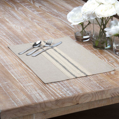 The Farmstead Placemat Set of 6 is a tasteful country farmhouse addition to your home. The dark creme and charcoal grey grain sack striped fabric strip is appliqued horizontally across the center for a timeless addition to your home.
