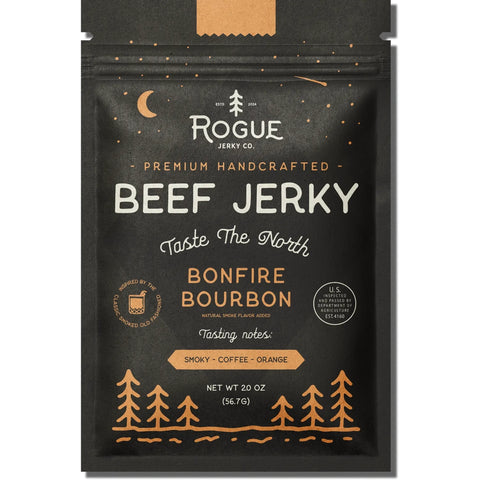 Bonfire Bourbon Beef Jerky unfolds with bold coffee and orange zest, layered over deep smoky bourbon undertones. Each bite is a nod to nights by the fire, with the spirited kick of a smoked old-fashioned—intense, captivating, pure Rogue.