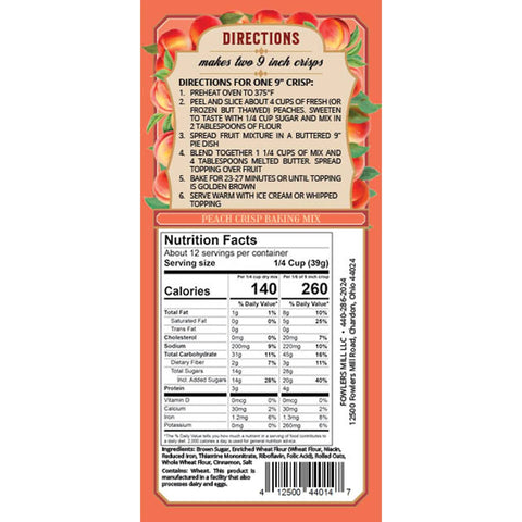 Bring some old-fashioned flavor to your kitchen with Peach Crisp Mix! A real classic, every bite of our cinnamon-y crumbles is bursting with cozy flavor. It's as easy as adding butter and, of course, peaches. (You don't even need to add love, we already put that in!) Get out your apron and make an old-fashioned masterpiece that's sure to draw rave reviews. Makes two 9" crisps with peaches, apples, cherries or other fruit.