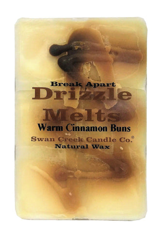 Scent your home with the inviting fragrance of the Swan Creek Candle Company® Drizzle Melts Warm Cinnamon Buns Melting Wax.  Richly scented melt smells like a pan of fresh-baked cinnamon rolls right out of the oven with sweet smooth vanilla icing.  The 100% natural soybean and beeswax blend is designed for use with wax-melting warmers, and breaks apart for convenient use.  Drizzle Melts Warm Cinnamon Buns Scented Melting Wax is triple scented and made of premium ingredients for hours of soothing, delightful aroma.  Size: 4.75 oz.