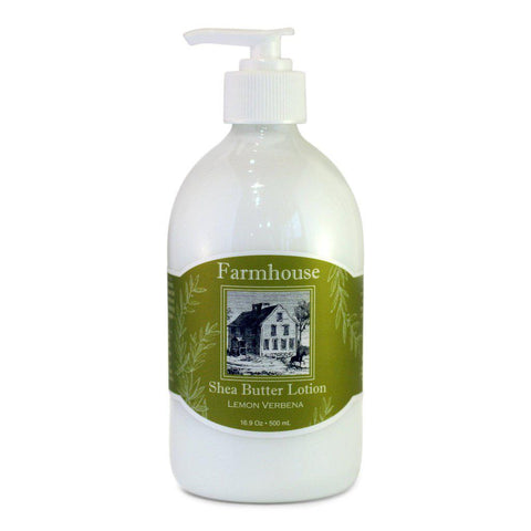 Farmhouse Shea Butter Lotion is suitable for hands and body. It contains shea butter and olive oil, a powerful combination of moisture and natural antioxidants. This lotion gets rave reviews for it's rich creamy texture and moisturizing abilities. Shea Butter is rich in natural moisture and vitamins, which can protect and heal the skin. Use this lotion daily to nourish and protect skin.  16.9 oz.  Made in USA.  Also Available in Hand Soap.