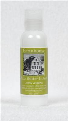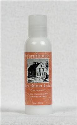 Mini Travel size is perfect for your purse, gym bag, carry-on bag or in your desk. Farmhouse Shea Butter Lotion is suitable for hands and body. It contains shea butter and olive oil, a powerful combination of moisture and natural antioxidants. This lotion gets rave reviews for it's rich creamy texture and moisturizing abilities. Shea Butter is rich in natural moisture and vitamins, which can protect and heal the skin. Use this lotion daily to nourish and protect skin. 2.0 oz. Made in USA.