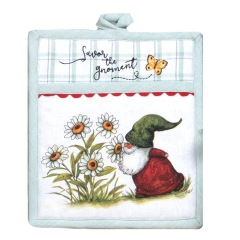 Turn your kitchen into an enchanted forest with this sweet Garden Gnomes Pot Holder to show guests there's no place like gnome. Embroidered "Savor the gnoment" phrase. Easy to slip on and off, this mitt offers heat protection to 200 degrees from hot pot and pan handles. Embroidery detail and decorative trim. his pot holder mitt makes it easy to grab hot pot and pan handles.