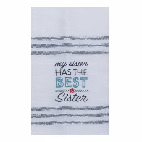 Our Best Sister Floral Ticking Stripe Tea Towel adds country floral charm to your kitchen. What a great humorous gift!