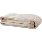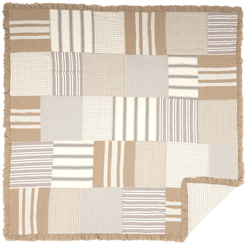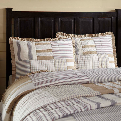 Our Graycie Quilt is a fun and eccentric combination of variously sized patterns and patches. Elegant enlarged ticking stripes - a farmhouse staple - are spaced among checks and windowpanes and encompassed with a ruffled burlap border, giving the quilt a breath of visual fresh air. Hand-quilted, 100% cotton.